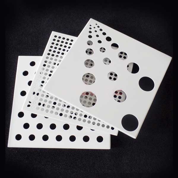 與常規鋁單板相比,沖孔鋁單板的特征就是表面形狀各異的沖孔(包括圓孔、方孔、五角星、六邊形孔等),裝飾效果突出,也能夠在一定程度上起到降低噪音的作用。集裝飾性與實用性于一體,沖孔鋁單板在工程裝飾中使用的越來越多。