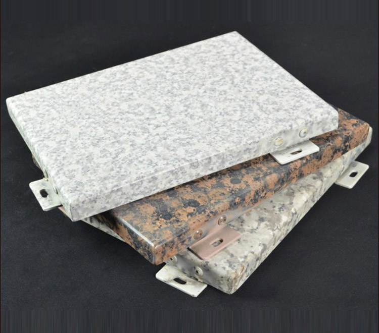 仿石紋氟碳鋁單板的主要特征是鋁單板表面逼真的石紋色,裝飾效果喜人,且質量輕、安裝方便,幾乎可以替代大理石這種幕墻材料。它主要通過熱轉印等工藝,把石紋色轉印到鋁板表面,然后再噴上氟碳罩光漆,經過多次噴涂和烘烤,終客戶定制的石紋效果。