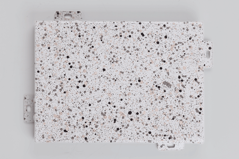 仿石紋氟碳鋁單板的主要特征是鋁單板表面逼真的石紋色,裝飾效果喜人,且質量輕、安裝方便,幾乎可以替代大理石這種幕墻材料。它主要通過熱轉印等工藝,把石紋色轉印到鋁板表面,然后再噴上氟碳罩光漆,經過多次噴涂和烘烤,終客戶定制的石紋效果。